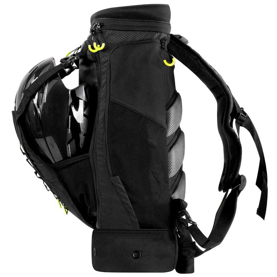 * ERGONOMIC DESIGN: Integrated waist belt and back padding for comfort and support. * DURABLE: Built with premium lightweight, durable fabrics and materials. * WET AND DRY ZONES: Separate bottom compartments for your wet and dry clothes. * STAY ORGANIZED: Customizable main compartment accommodates various shapes and sizes. Adjustable front helmet pocket. Attached 2-pc. carabiner and front loops to hang accessories. |