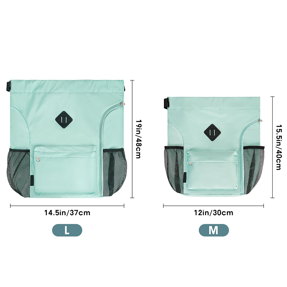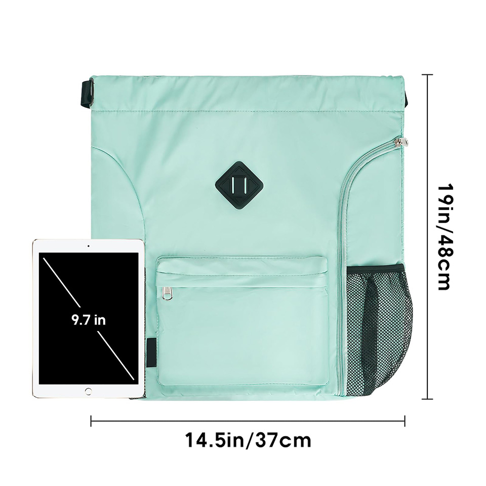 【Separate Shoe Compartment】This drawstring gym bag has a shoe compartment to store your shoes or other sports accessories, separate from your other items. It can also be used as a normal pocket for daily use. 【Large Capacity】The size of this drawstring gym bag is 19*14.5*6.2 inches, big enough to hold most of your sports gear or daily necessities. Also inside the main compartment is 1 interior zipper pocket and 2 interior wall pockets to perfectly organize your belongings. 【Multiple Pockets】The hidden back pocket of the drawstring gym bag keeps your phone and wallet safe, while the front zipper pocket allows you to easily access the keys or passport that you don't want to rummage through. 2 side mesh pockets keep frozen water bottles or wet umbrellas separate from other gear. 【Design Details】The drawstring gym bag is made of tear-resistant and waterproof fabric. Widened shoulder straps take the pressure off your shoulders and can be easily adjusted to a custom length. Plus, the drawstring gym bag comes with a hanging loop for easy storage. 【Multiple Uses】This drawstring gym bag can hold all your active essentials, such as basketball, football, baseball glove or volleyball, etc. It can also be used as a daily use bag for library, shopping, training, and hiking.