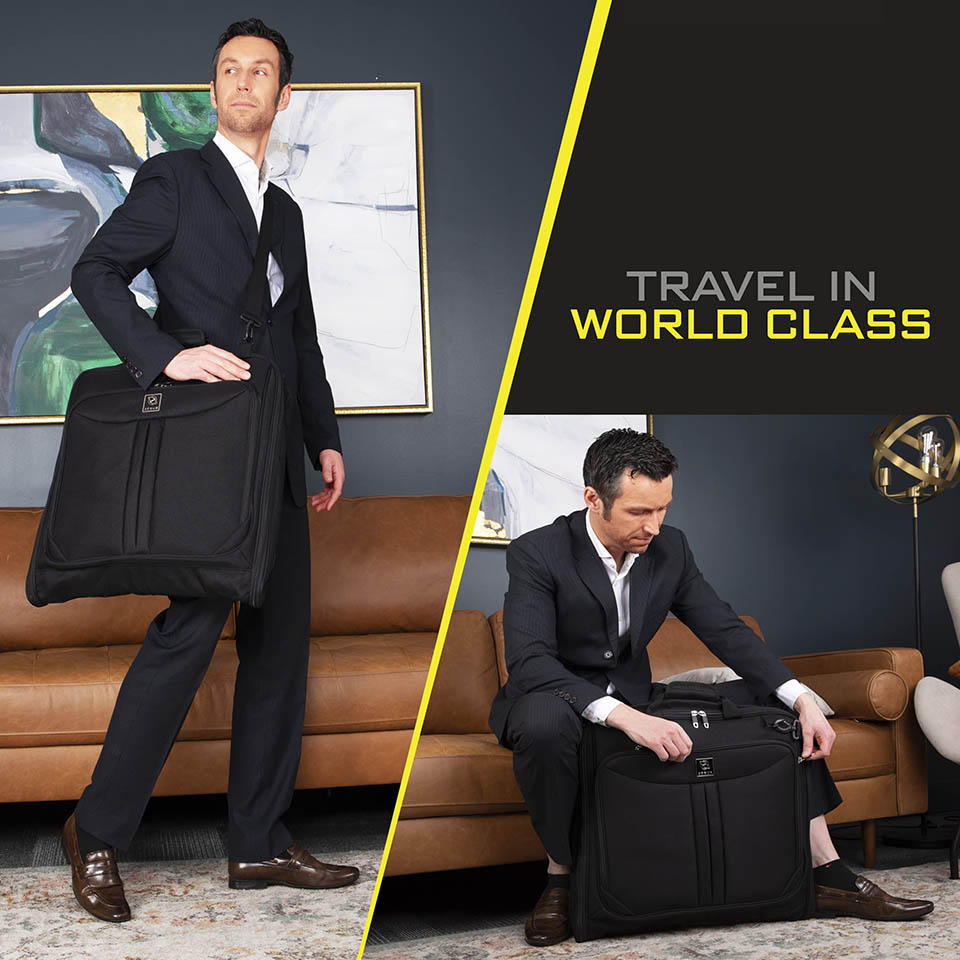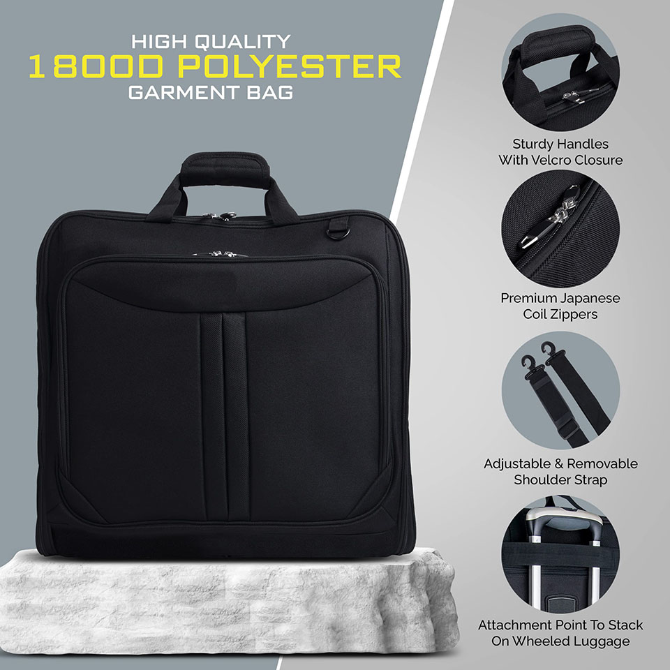 KEEP CLOTHES CLEAN AND UNWRINKLED: Our heavy-duty hang-up bag protects clothing items large and small. An interior dual buckle holds your garments in place and partners with our unique piped design, ensuring that items don’t crease or crumple during travel CONVENIENT SIZE FITS IN OVERHEAD BINS: Measures 22" square when closed with a depth capacity of over 4"; empty weight under 3 pounds. Comfort handles, an adjustable detachable shoulder strap, and an attachment point for stacking on rolling wheeled luggage. Be sure to check with your airline for carry-on sizing PREMIUM JAPANESE ZIPPERS AND LONG-LASTING DESIGN: Style meets function with premium coil zippers and two-tone pulls. Fray-resistant and rugged 1800D Polyester material provides a waterproof exterior to guarantee that you’ll use this bag for years to come TRAVEL IN WORLD CLASS: Maximized storage capacity for an attractive combination closet and briefcase on the go. With a professional exterior look and an elegantly imprinted full interior lining, this is the best travel garment suitcase available today. 5-year warranty |