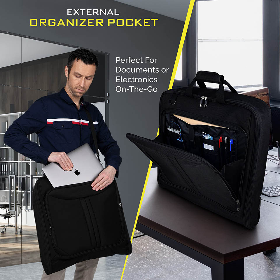 HYBRID SOFT-BODY GARMENT BAG WITH SEMIRIGID STRUCTURE PIPING: Over-shoulder clothing carrier offers stress-free protection for your business trip, wedding, or weekend getaway. Multiple interior zipper pockets hold everything from suits and dresses to shoes and ties. A spacious exterior pocket provides easy access to electronics and documents