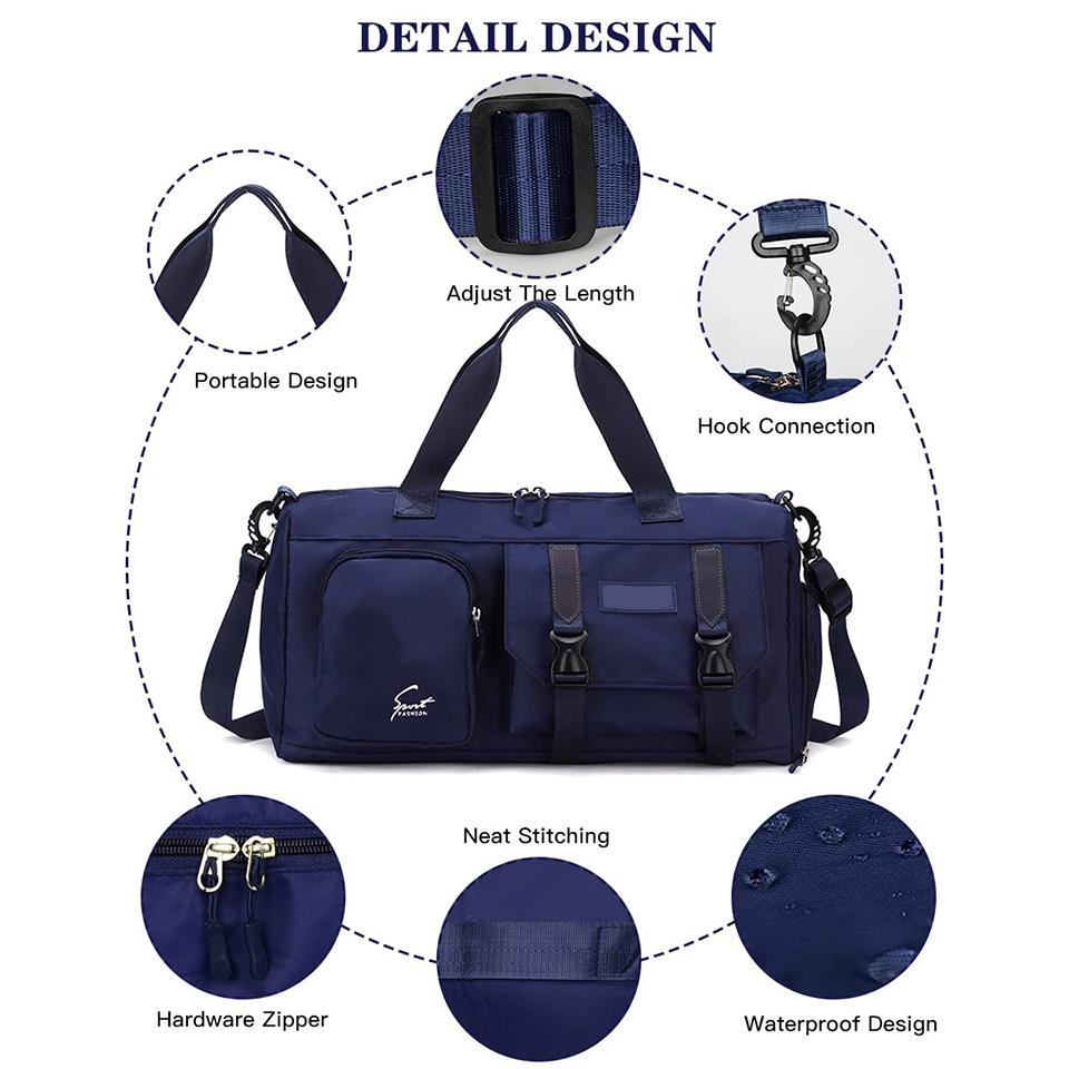 Essential details Style: Fashion Place of Origin: Fujian, China Material: Polyester Have Drawbars: NO Pattern Type: Letter Gender: Unisex Closure Type: zipper Product name: Tote Gym Bag Logo: Customs Logo Color: Customized Colors Packing: 1pc/polybag Design: Fashionable Feature: Lightweight Function: Multi-functional Usage: Outdoor Sports Type: Wear-resistant Waterproof Duffle Gym Bag