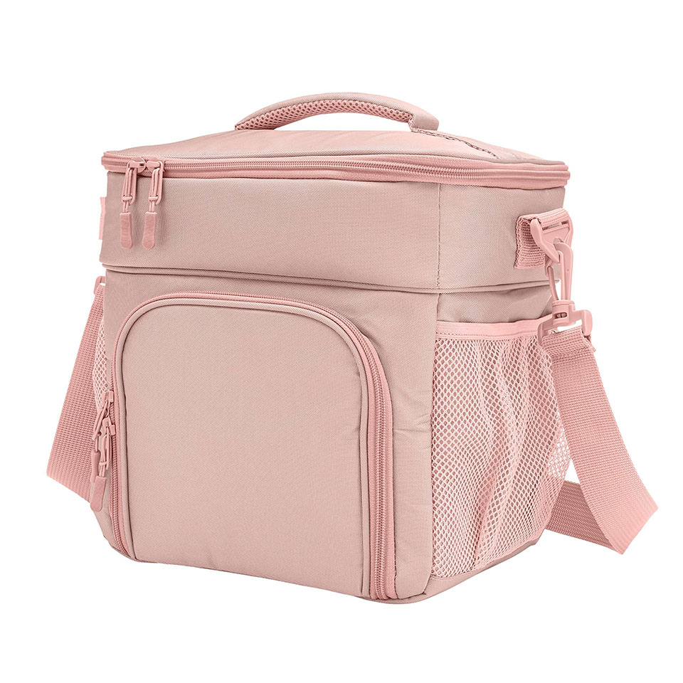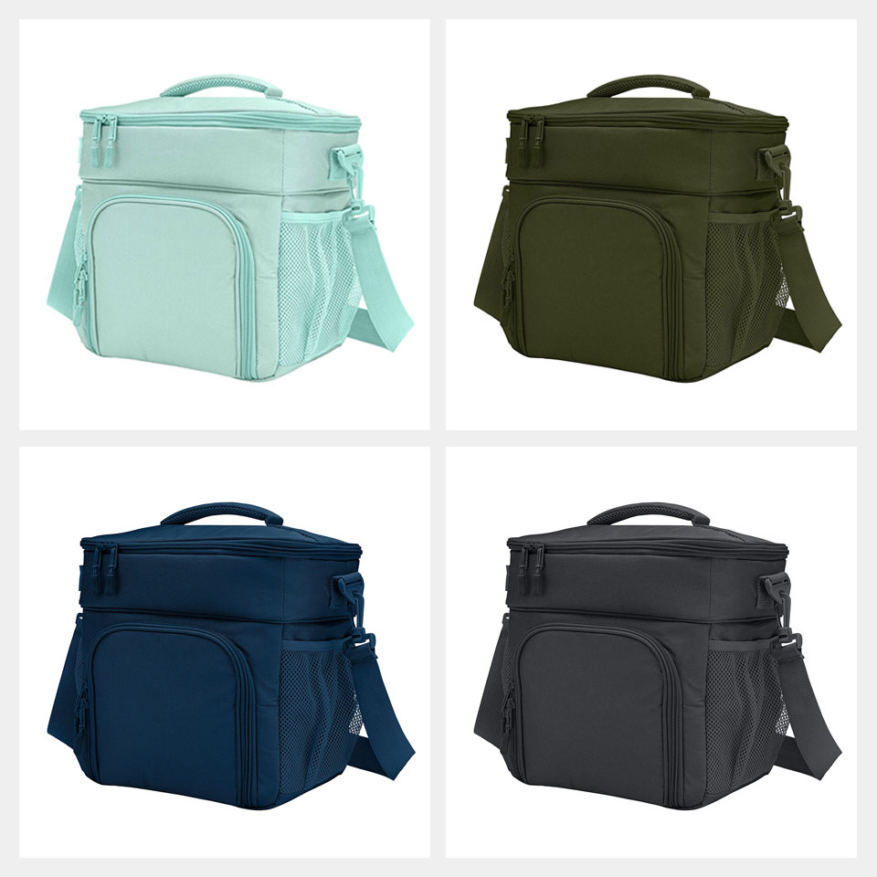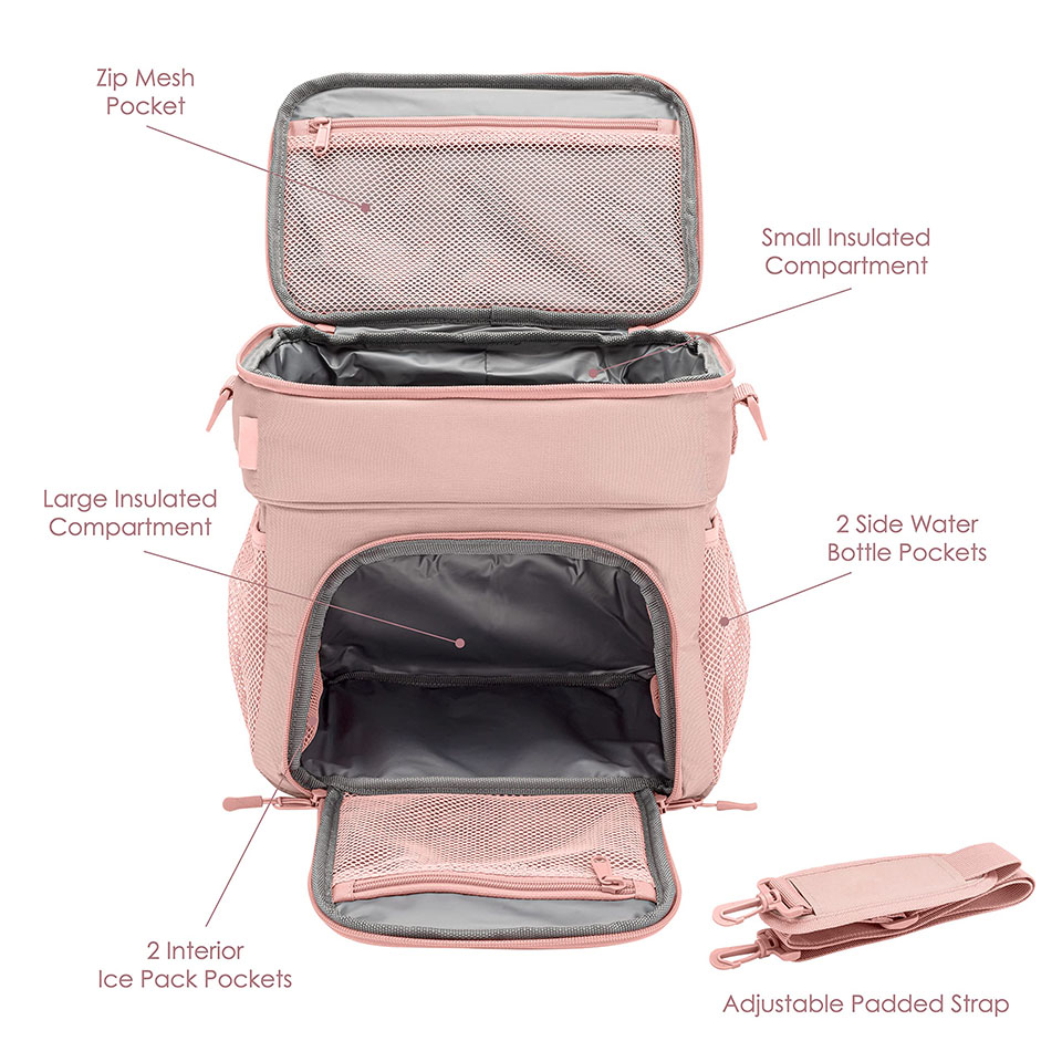 Two Separate insulated compartments. Front zippered pocket and two side mesh pockets INTENDED USE: Cooler, Lunch Cooler, Soda Can Insulated Holder, Picnic Cooler, Lunch Pail This cooler bag is perfect for a daily lunch pail or picnic outing for 2 Comes with Top insulated compartment and side mesh pockets to hold whatever you need. Comes with a carry strap for easy carrying to and from work.