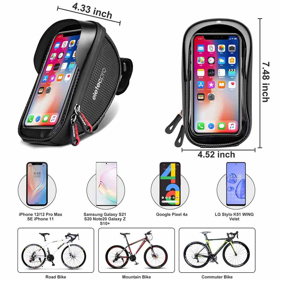 * SENSITIVE TOUCH SCREEN: The bike handlebar bag with high sensitive TPU film window which convenience for you to opretate on the phone with bike bag while protecting your phones securely on the handlebar. Perfect compatible with iPhone 12/12Pro/SE/11Pro/11/XR/X/8Plus,Samsung Galaxy S20+/S20/S10+/S10/S10e/S9+/S9 Cellphones below 6.5 inches.