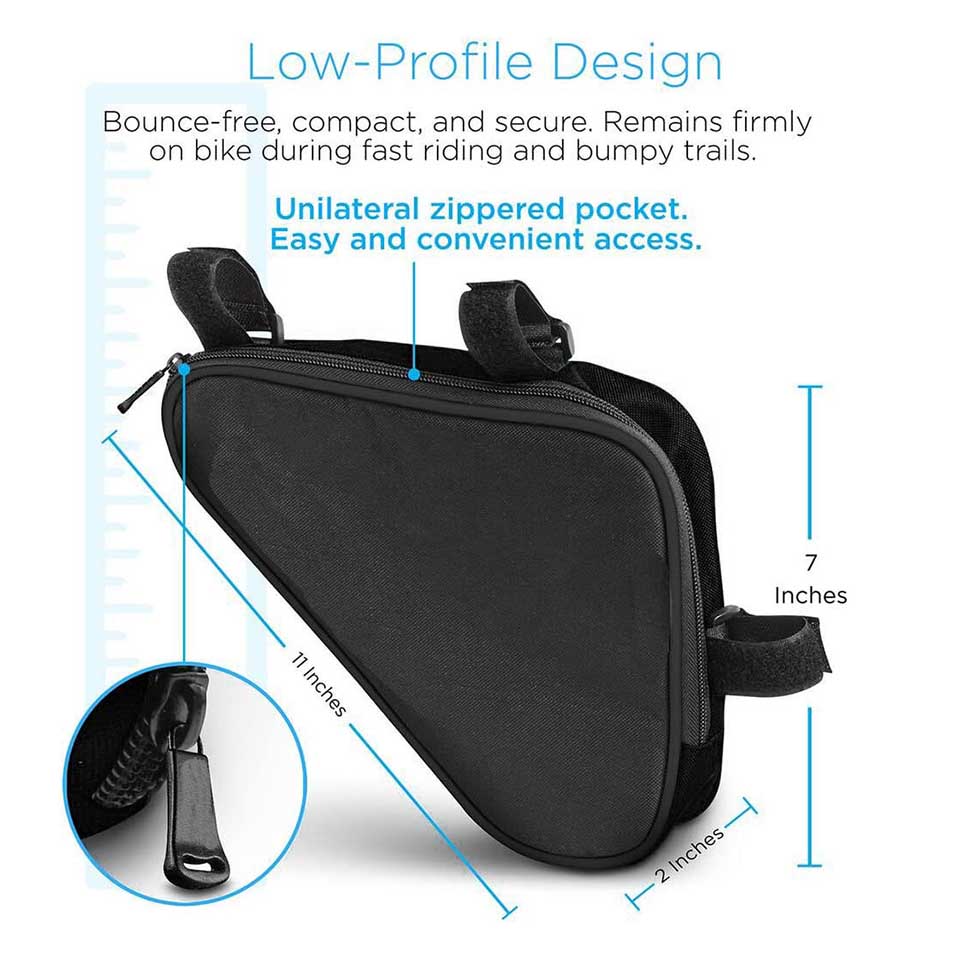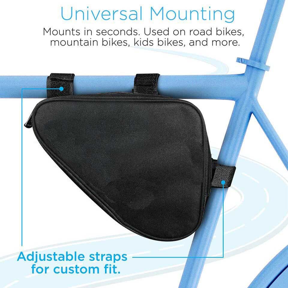 * Cycling saddle bag easily connects under bike top tube with adjustable velcro straps for custom fit