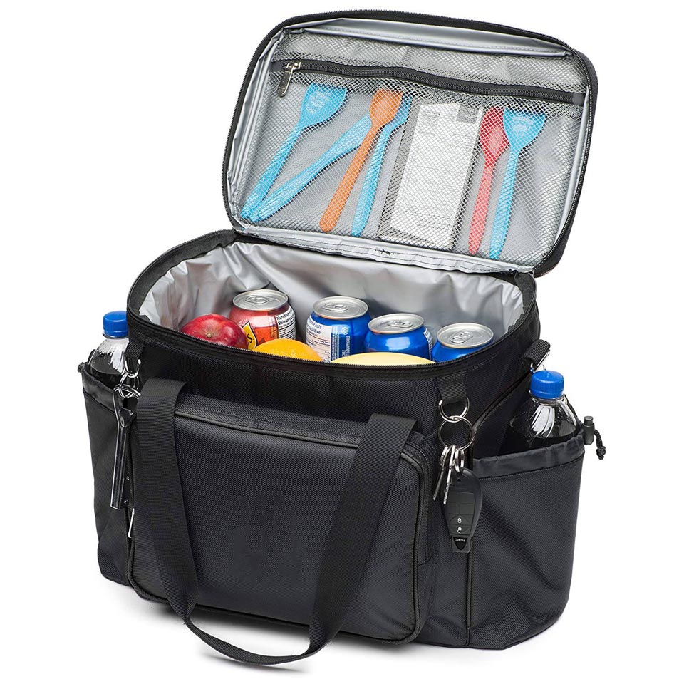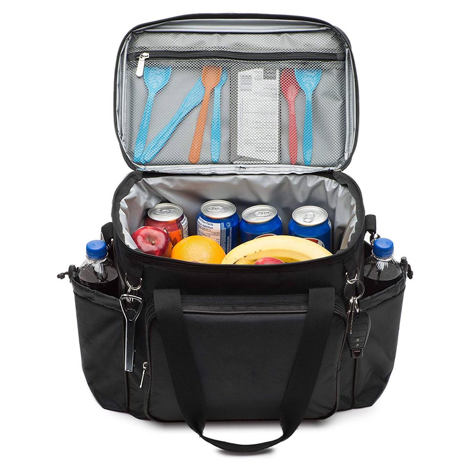 stainless steel clips. 1680D is the strongest material compared to commonly used 600D or other lower grade fabric for lunch bags, coolers & lunch boxes. * MULTIPLE POCKETS - LOTS OF ROOM: Two large, wide and deep side pockets (8 x 9 Inches), each pocket can hold multiple bottles. Front fully insulated 11x8 inches pocket can be used for sandwiches, containers, gadgets etc. 11 inch wide trolley pass through for luggage handles at the back. Mesh pocket inside the lid. * LONG LASTING COOLING: Cooler Lunch bag is thickly insulated with EPE foam and thick grey peva liner to maximize cooling. To increase cooling further use ice packs made for cooler bags. Cooler is not intended to put open ice, open liquid or homemade plastic ice packs as sharp edges of ice can damage the liner. |