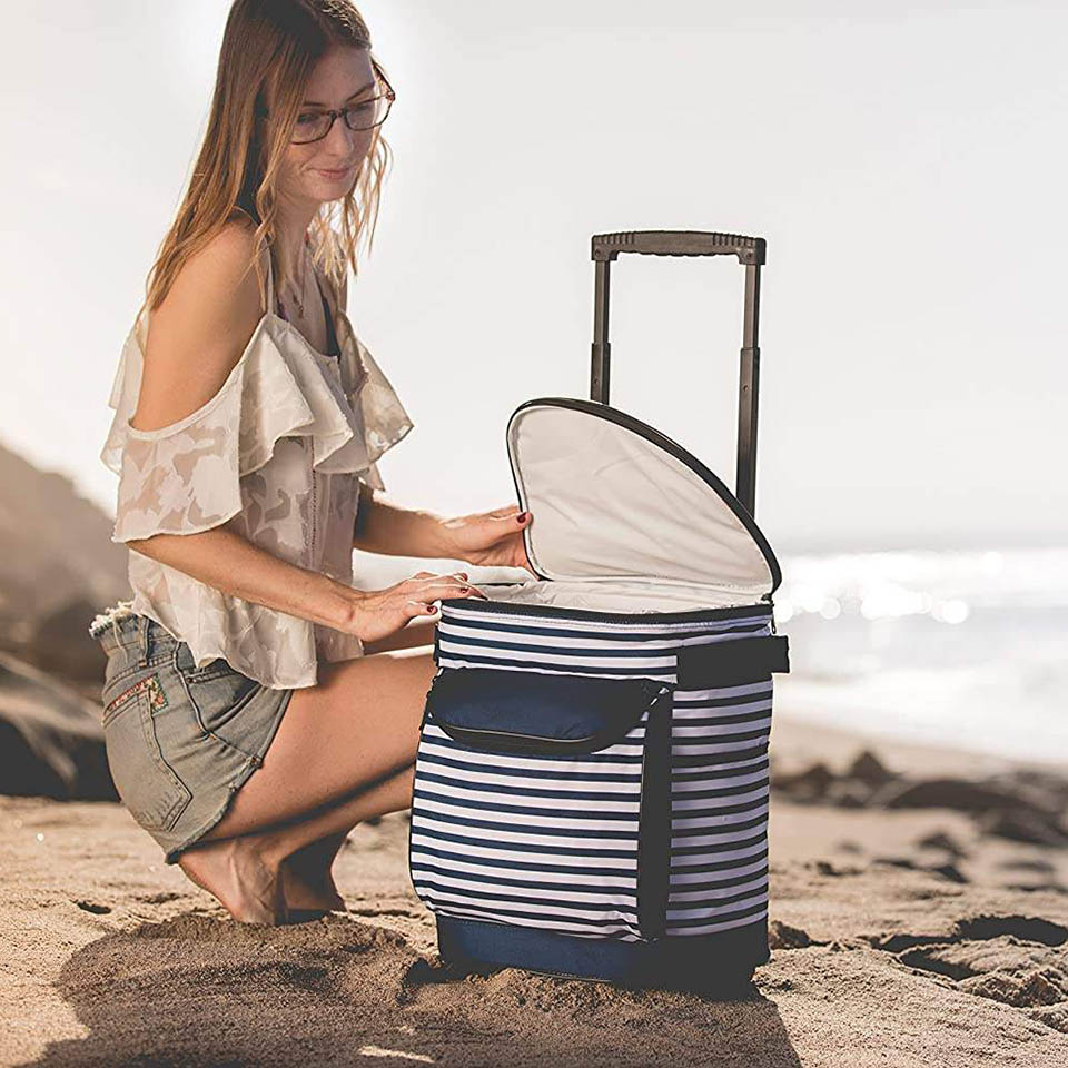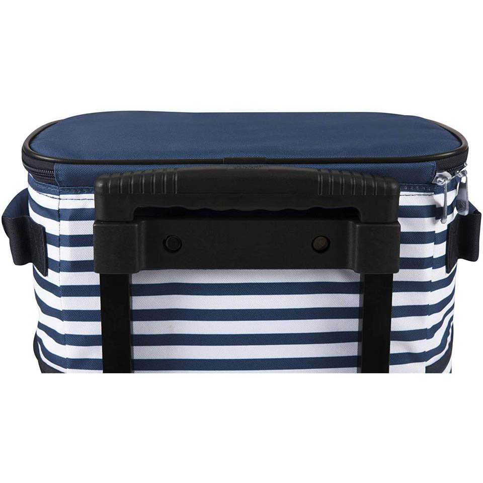 * Insulated main storage area with removable heat-sealed, water-resistant PEVA liner keeps your food and beverages at the right temperature * Zippered front pocket is spacious, perfect for paper plates, napkins, utensils and condiments; Slip-in side pockets are great for water bottles * Wheeled cooler has integrated telescoping handle for comfortable transport; Built-in side handles for lifting onto an elevated surface |