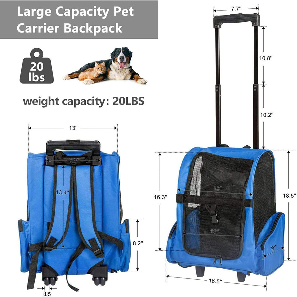 * Support & Handle Design: The pet roller backpack has removable plastic supports at the bottom to provide a comfortable support space for the animal. The multi-stage telescopic handle offers you different sizes for different age groups. * Mesh Design: The 3-sided mesh design provides your pet with fresh air and is suitable for long-term travel with animals. The open and close zipper makes it easy to get in, out and feeding your pet, while also allowing your pet to stick its head out for sight-seeing. * Airline Approved: pet backpack can meet most of your travel needs. With this backpack you can take your pet on most of the planes, except for individual airlines that you need to confirm individually. * Side Pouches & Pet Hasp Design: Large side pockets are perfect for safely storing your dog treats, toys and other essentials! There is a buckle inside to hold your pet in place like a seat belt to protect them from collisions and also keep them from running around. |