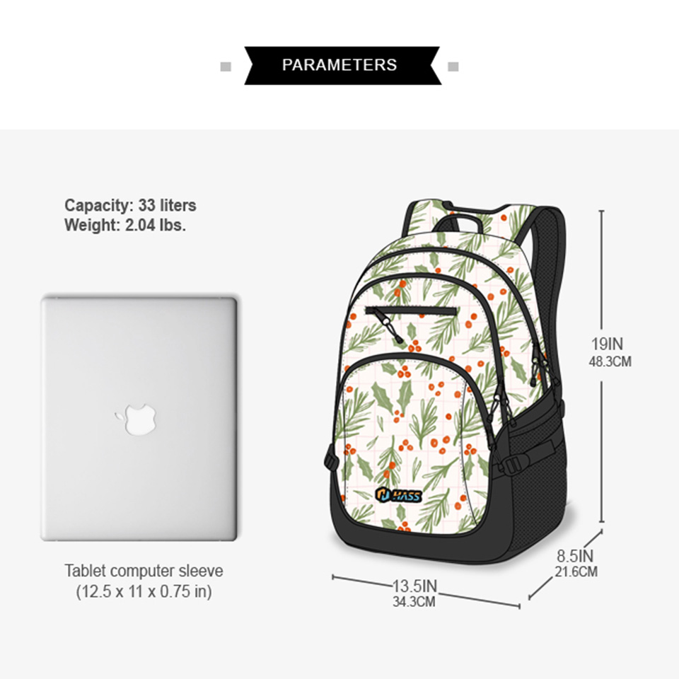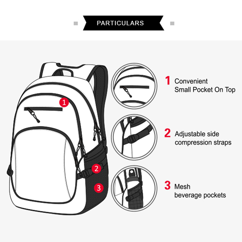 Essential details Application: Outdoor, Travel, College, Scool, Laptop bag Material: Polyester Capacity: 22L               Color: Customized Certificates: BSCI,Sedex,TUV,ISO9001 Sample time: 5-7 Days Warranty: 1 year against defect of materials and manufacturing OEM/ODM: Acceptable MOQ: 500pcs
