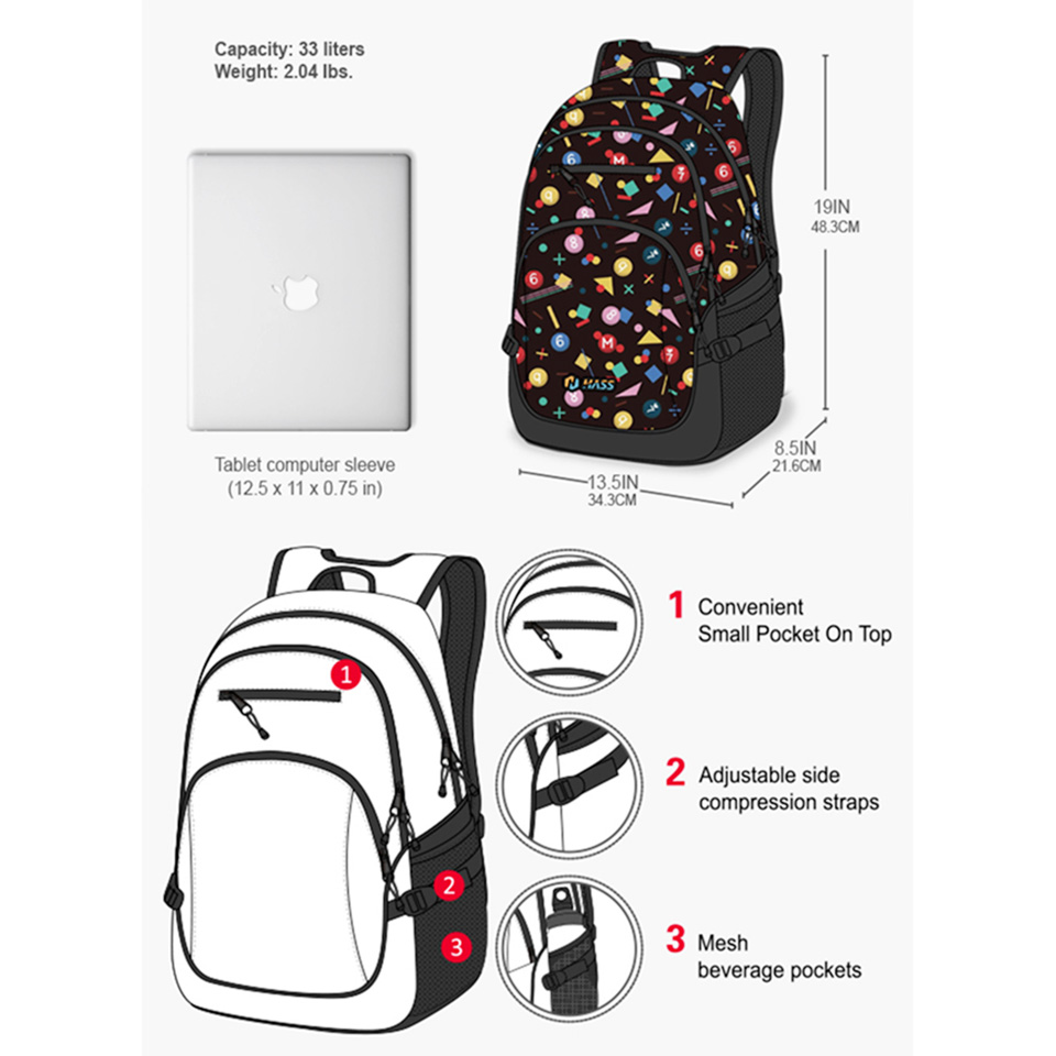 LARGE,MULTI-COMPARTMENT DESIGN Dimensions: 19 x 13.5 x 8.5inch Main compartment + secondary pockets with tablet sleeve Organization + 2 accessory pockets A dedicated sleeve for your tablet. Compression straps are designed to cinch down And secure gear while carrying. HIGH CAPACITY For School, Travel or Work Bookback with tablet sleeve PARTICULARS PRODUCT EXHIBITION |