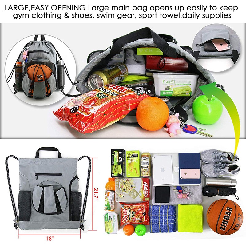 * LARGE SIZE: This gym drawstring backpack with large compartment measures 18" x 21.7" which is big enough for carrying gym clothing & shoes, swim gear, sports towel, daily supplies. Perfect for gym, sport, yoga, dance, travel, carry-on, luggage, camping, hiking, teamwork, training and more.