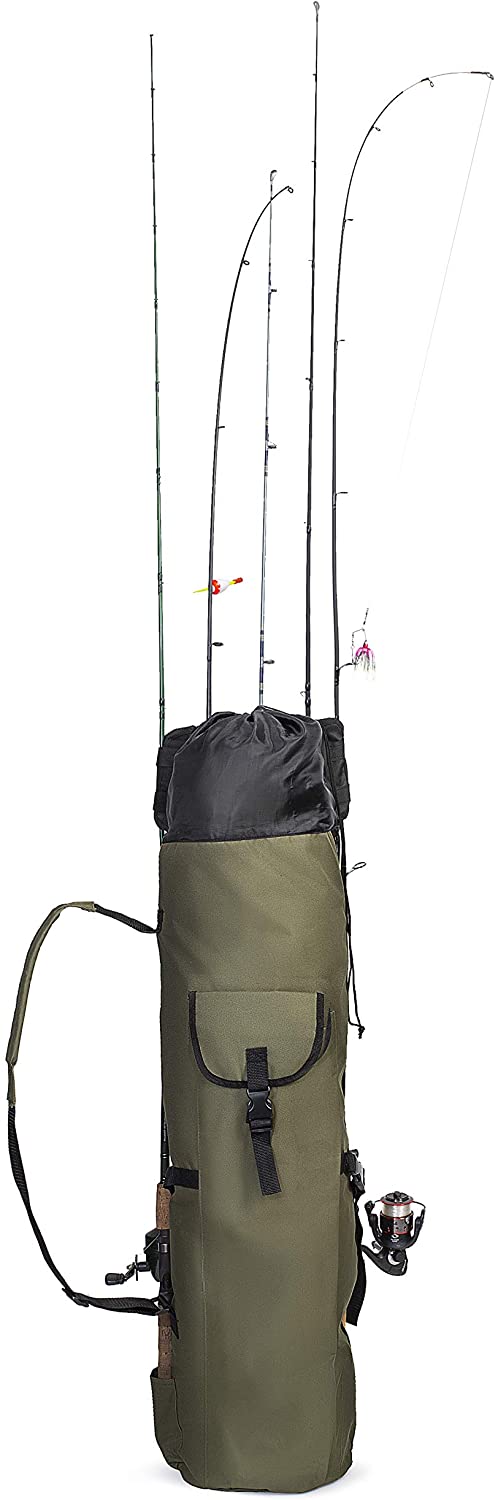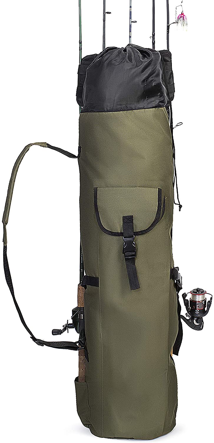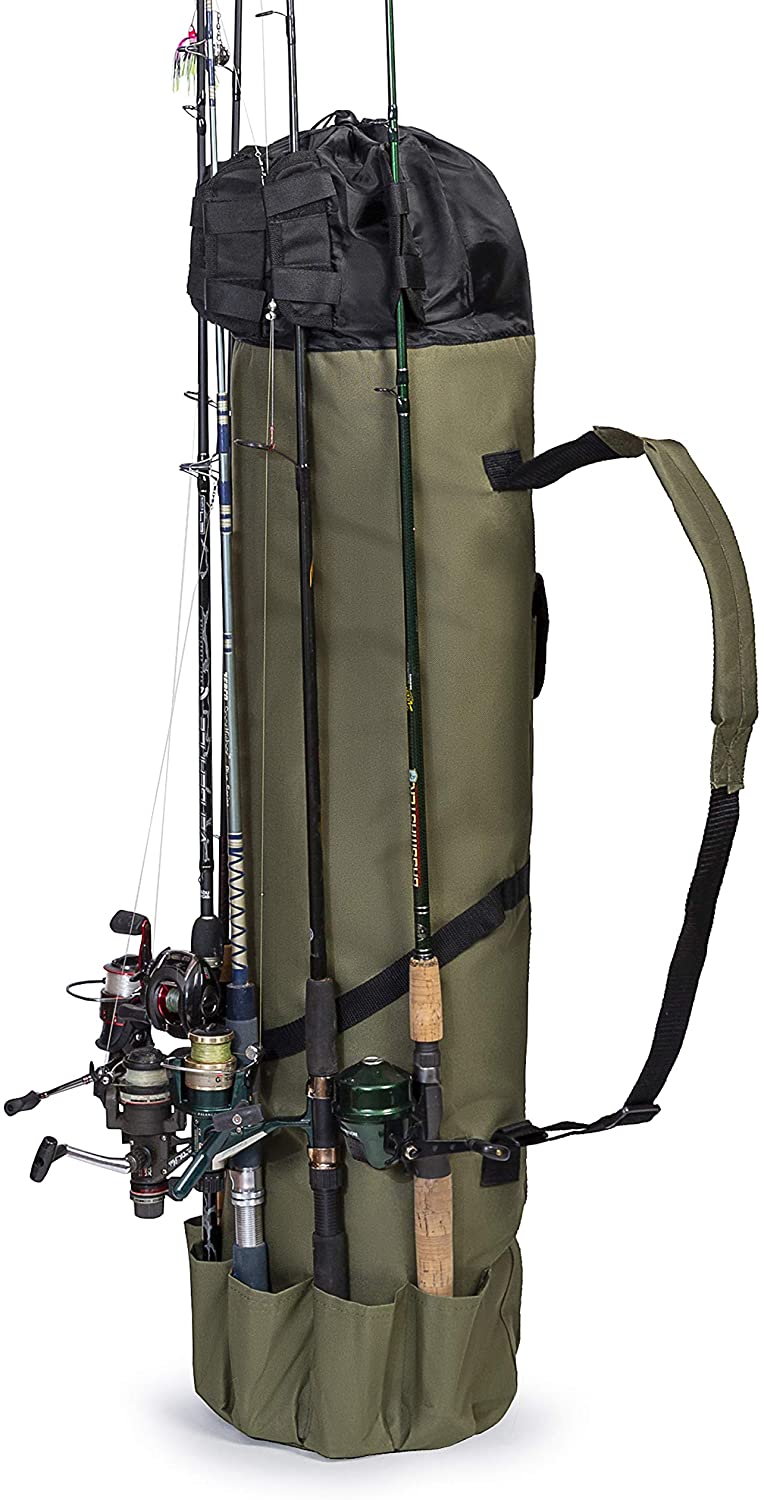 * [Large Capacity]: The fishing rod case is large capacity that can holds 5 rods and reels on the outside and a spacious main storage compartment, as well as its side pocket for extra storage.