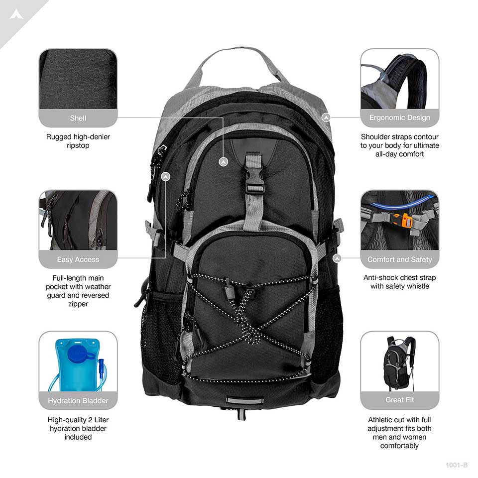 * FREE HYDRATION BLADDER: 2-Liter; Durable, kink-free sip tube and push-lock cushioned bite valve; Large 2-inch (5 cm) opening for ice and easy cleaning * CUSTOMIZABLE COMFORT: Backpack for men, women, and youth; Adjusts to fit all frames comfortably; Notched foam stabilizer and mesh covering means you can wear this pack for hours * TRUSTED QUALITY: Over 1,000 verified 5-star reviews testifying to the quality and design; Large main pocket protects gear, clothes, and lunch; Bungee cord system for cycling and climbing helmets |