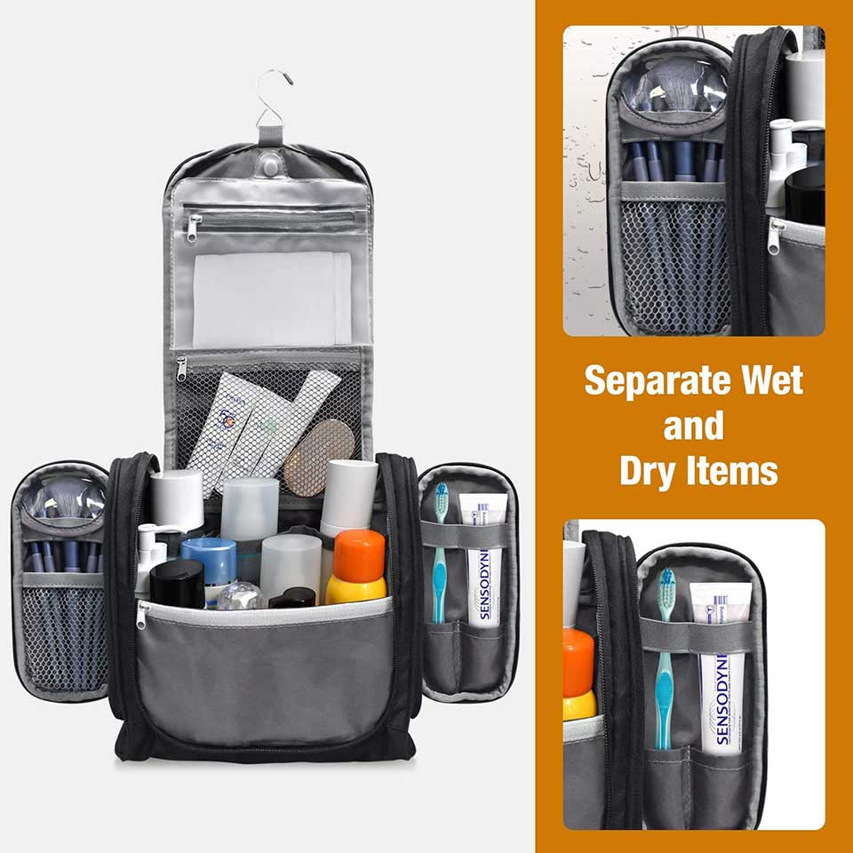 【Travel Toiletry Organizer Has 16 Compartments】1 large main compartment can store a variety of toiletries and cosmetics that fit the size of a toiletry bag; 2 large mesh pockets on the top of the main compartment are visually designed for storing everyday items; 1 removable waterproof pocket at the top of the main compartment is convenient for wet towels and other items, keeping wet and dry items separate; 2 zippered pockets on both sides for storing small items as makeup brush