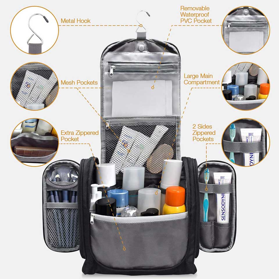 【Focus on Customer Experience, Reflecting the Details of Design】 Clear mesh pockets use a visual design so items are visible and you can get your stuff in seconds without having to search for personal items in the mess; Keeps items separated wet and dry; Different size elastic straps fit different size container; Built-in metal hooks offer a variety of hanging options, so you can hang your makeup bag on a towel rack, coat hook or anywhere available for easy access