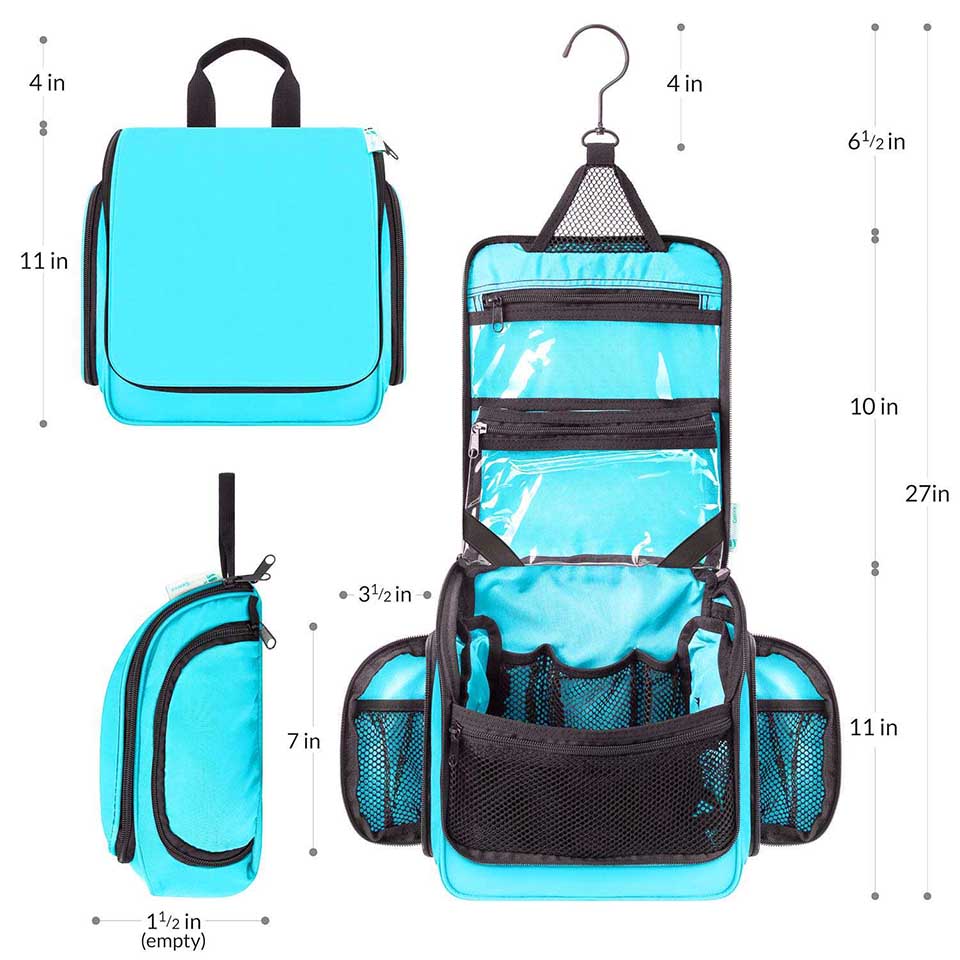 * ✈️ Unisex Hanging Toiletry, Makeup and Wash Bag. This travel bag has numerous pockets, strong zippers, dual side "wings", elastic holders and mesh pouches to store all travel toiletries, cosmetics and make-up in one portable, water-resistant bag. * ✈️ Organize your Travel Toiletries: This travel wash bag is compact yet large enough to carry all travel essentials upright. Perfect for individual, couple or family use. Side pockets with extra elastic loops and mesh bags for makeup, toothbrush and small travel items. Sturdy bottom assures your travel cosmetic bag remains upright and does not tip over on bathroom ledge or basin. * ✈️ Strong Metal Swivel Hook (360 degrees): The sturdy hook is large enough to hang your travel toiletry kit or wash bag from any hook, door, rod, basin or even a tree when camping. Easier than a shaving Dopp kit as toiletries are easily accessible and visible when hanging. A perfect travel toiletry bag and organizer. * ✈️ Extra Travel Savvy Bonuses: Included with the travel toiletry bag is a removable clear transparent travel TSA compliant zipper bag for tour travel essentials such a toothbrush, make-up, meds or wipes. Simply place in hand luggage for easy airport security checks and attach to toiletry bag at destination. The travel toiletry bag also comes in a versatile water-resistant drawstring bag perfect for wet items or shoes. |